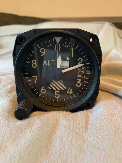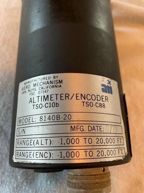 Good condition Aero Mechanism 8140B-20 encoding altimeter. Manufactured 8/79. Bright numbers, very clean glass, smooth operation. As removed.