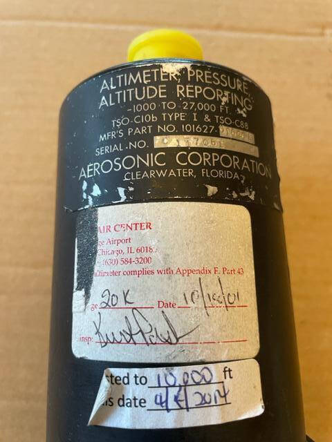 Aerosonic altimeter. Pressure altitude reporting. 14 to 28 volts. Last inspected 04/2014. Glass is very good and without hazing. Minimal to no fading in numbers and symbols. Case is very clean and without wear. Fits most aircraft.