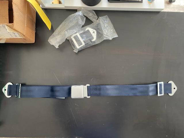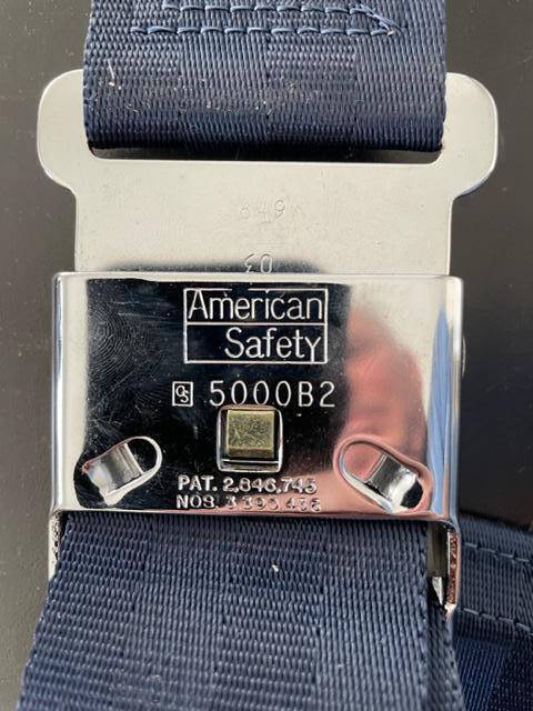New old stock American Safety lap belt set. Dark navy blue in prefect, new condition. Male and female sides. Two available.