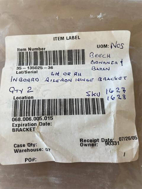 New old stock Beech Baron and Bonanza LEFT or RIGHT Inboard aileron hinge bracket.