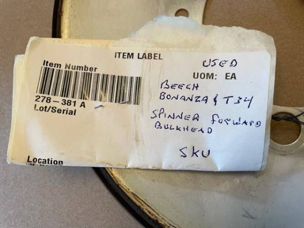 Very good condition Beech Bonanza and T-34 spinner forward bulkhead. Looks to be unused but has two places where bolts were applied. Has original Beech pic tag attached. See photos for details. No damage and no corrosion. Pricing as used since I cannot verify it is new old stock.