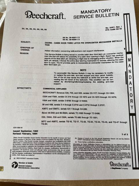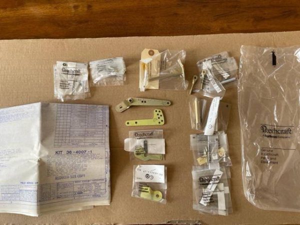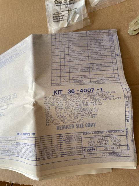New in the original package Beechcraft Single and Twin engine cabin door third latch pin over center mechanism installation kit. Iincludes inventory sheet, blue prints, and all required parts.