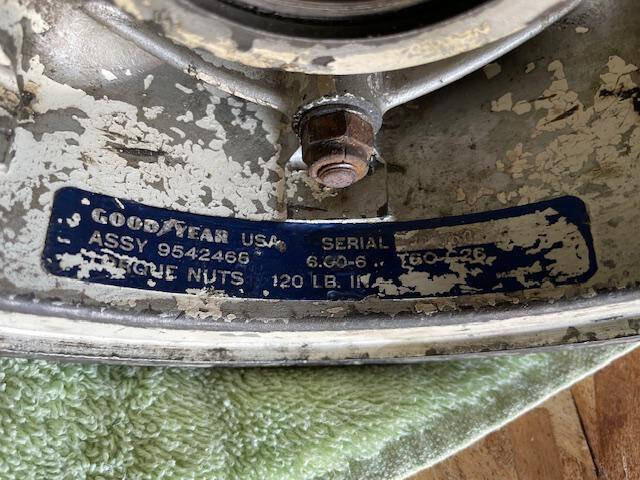Beechcraft Bonanza 33 thru E33 Goodyear 6.00 X 6 main wheel. Type III. The parts I can see are in good condition; no rim chipping, no corrosion visible, no damage, see photos. They are dirty and would benefit from paint.