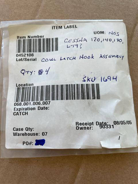 New old stock Cessna 120, 140, 170 and L-19 cowl latch hook assembly.