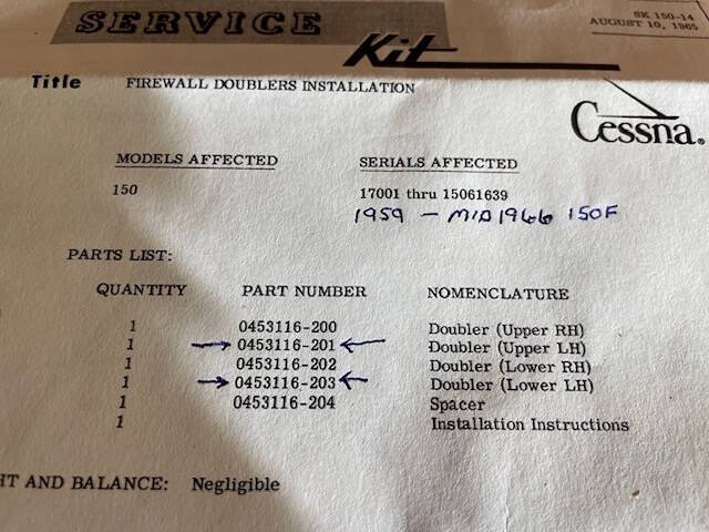 New old stock Cessna 150 firewall doubler-Lower LEFT. From Service Kit SK150-14. SN range: 17001 thru 15061639 1959 C-150 thru mid 1966 C-150F