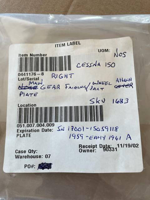 New old stock Cessna 150 RIGHT main landing gear fairing/wheel pant attachment plate assembly.
