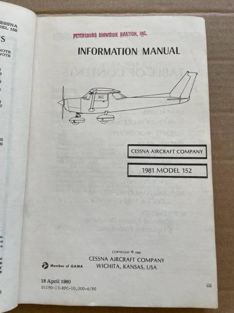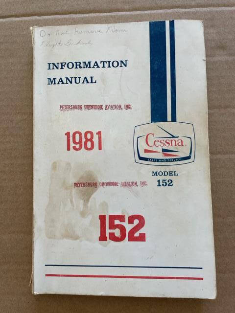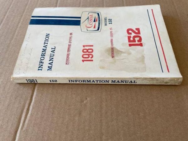 1981 Cessna 152 Information Manual. The cover and spine has some wear and staining but the pages are in excellent condition. Page edges are good.