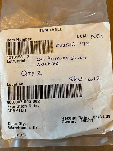 New old stock Cessna 172 and other oil pressure switch adapter. 2 available.