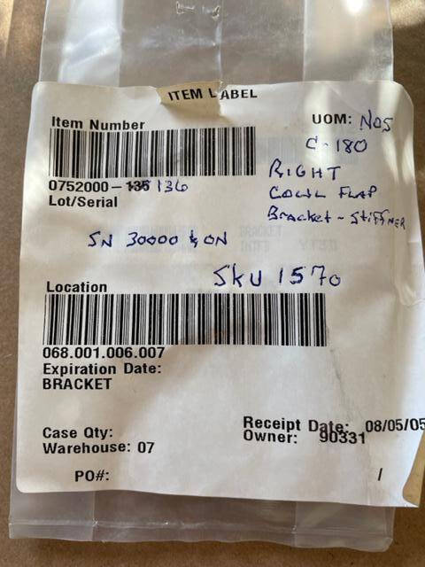 New old stock Cessna 180 RIGHT Hand cowl flap stiffener/bracket.