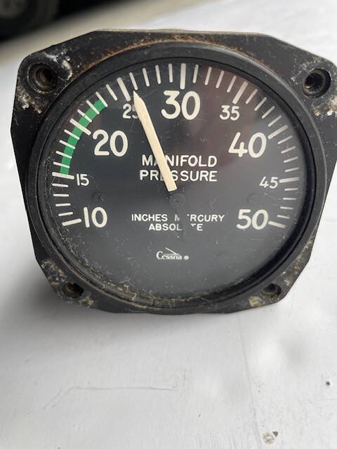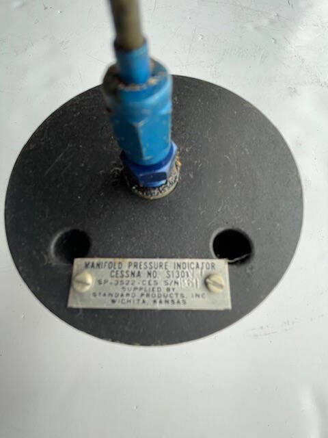 Cessna 182E manifold pressure gauge with intake line. Good condition with good glass and markings are bright and clear. Removed from a 1962 Cessna 182E, N2987Y, SN 18253987.