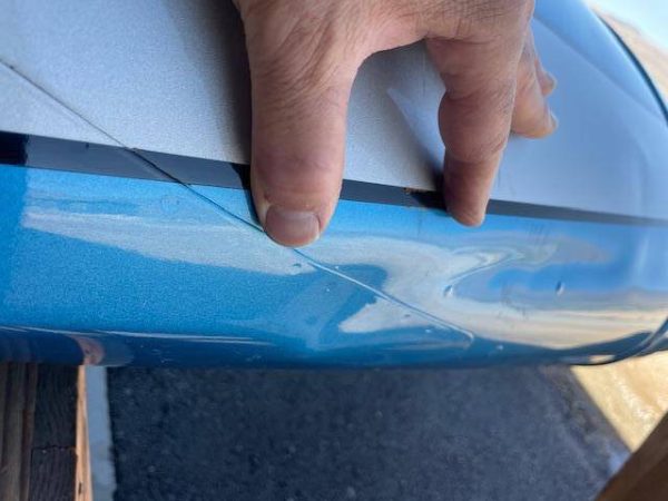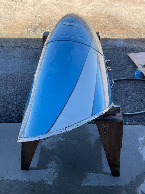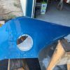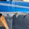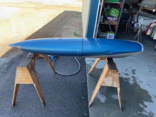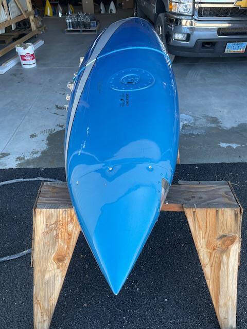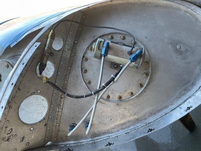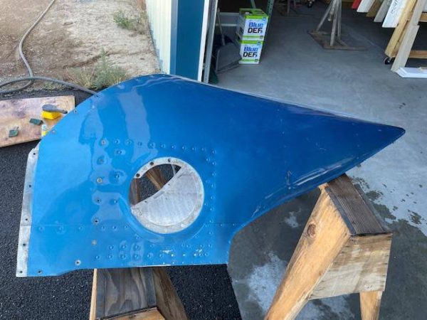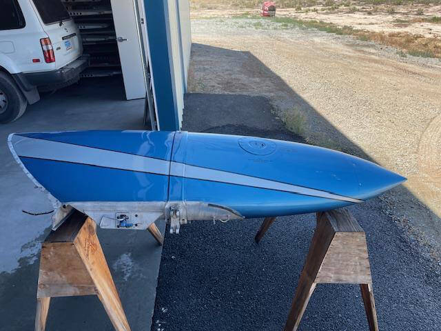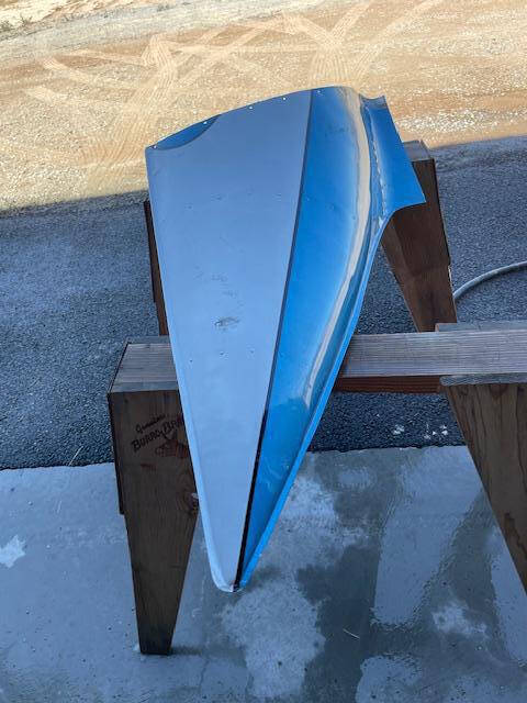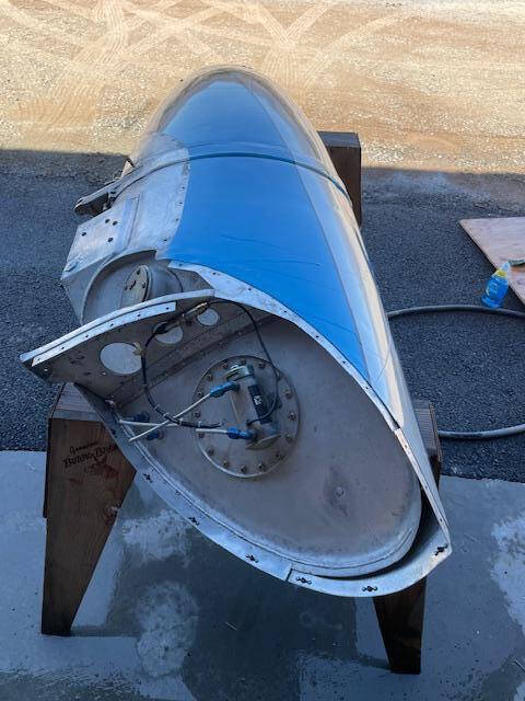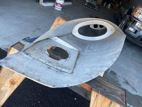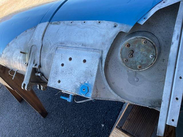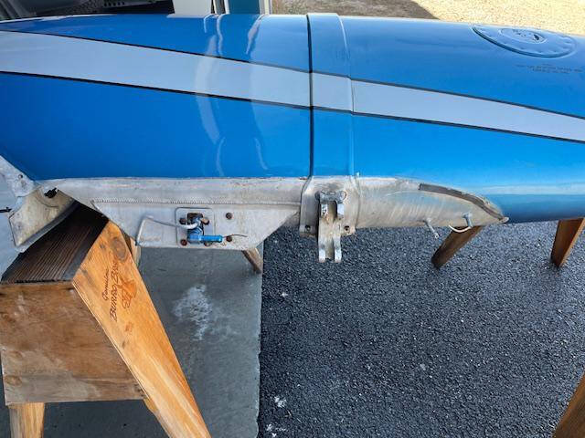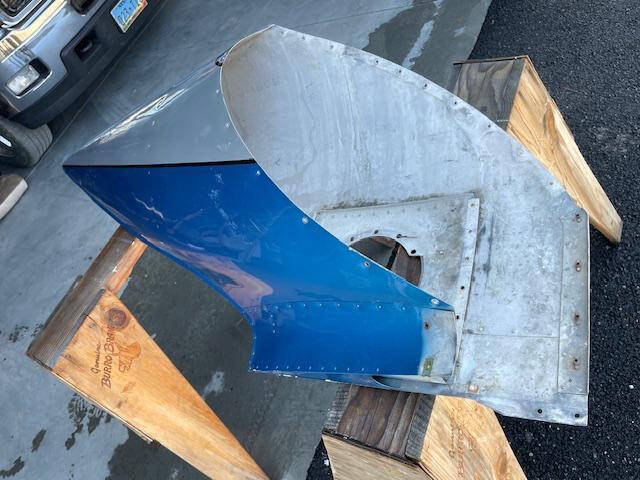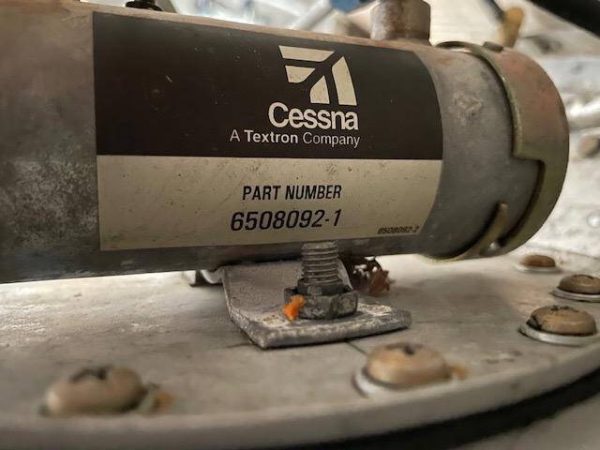 Cessna 310K LEFT main wing tip fuel tank. Tank is complete with main fuel pump, transfer pump, fuel sending unit, fuel cap, and nav light assembly. The paint is in excellent condition but the tank has a few dents and creases; no hail damage, no repairs, and no corrosion, see photos.