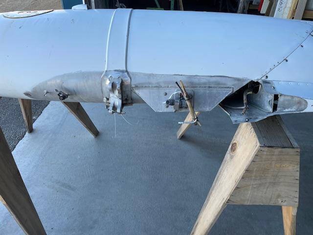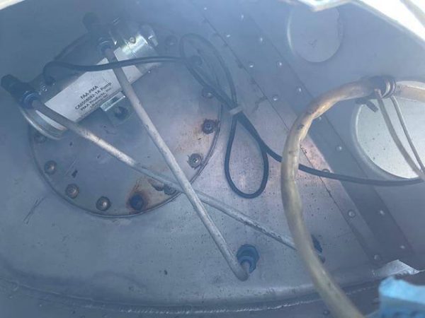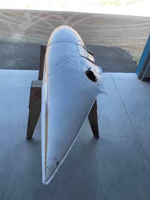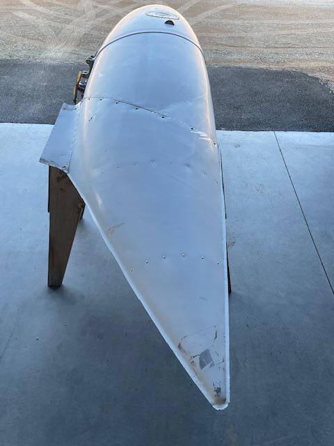 Cessna 310K RIGHT main wing tip fuel tank. The tank is complete with main fuel pump, transfer pump, fuel sending unit, fuel cap and nav light assembly. The tank has faded paint but is in good conditioin with a few creases, no hail damage, no significant dents, no repairs, and no corrosion, see photos.