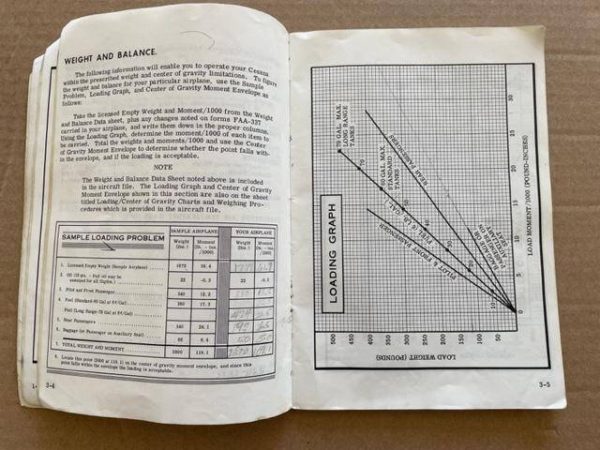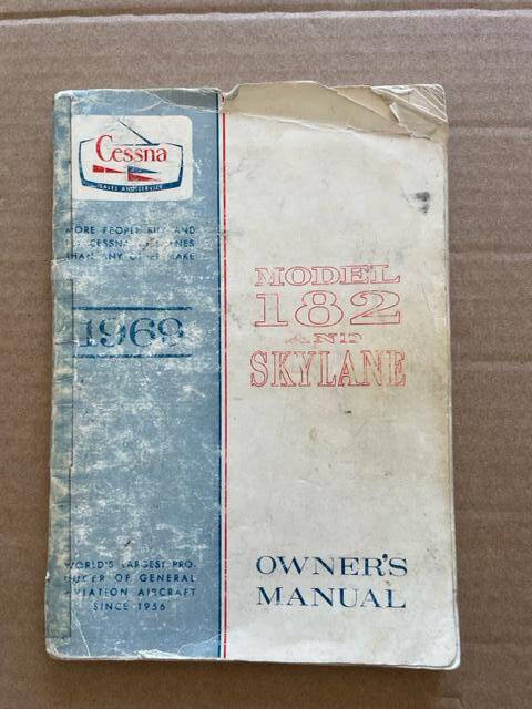 Below average condition 1969 Cessna Model 182 And Skylane Owner’s Manual. Cover is rough, tape on spine, some minor stains on pages. It is usable despite flaws.