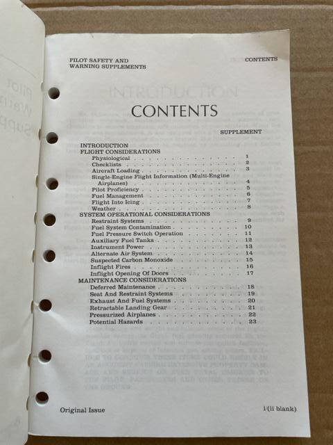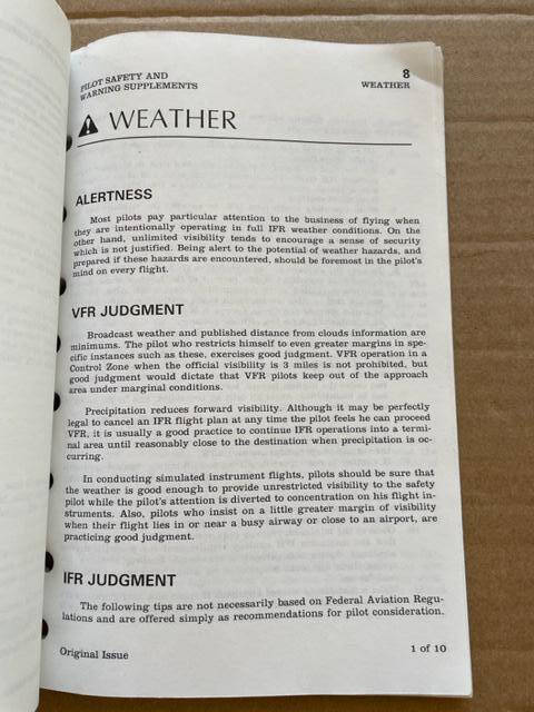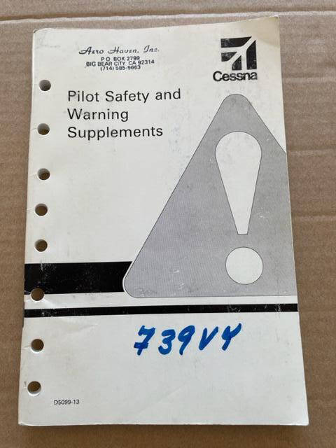 Good condition Cessna Pilot Safety And Warning Supplements book. 1985 publish date. Cover has wear and is dirty on the obverse. N number on cover. Pages are in good condition.