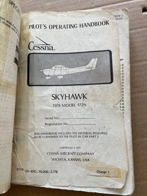 Poor condition 1978 Skyhawk Pilot’s Operating Handbook. 1978 172N. Cover is completely taped, pages are dirty and stained, see photos for details. Inspite of flaws the handbook is serviceable with all pages intact.