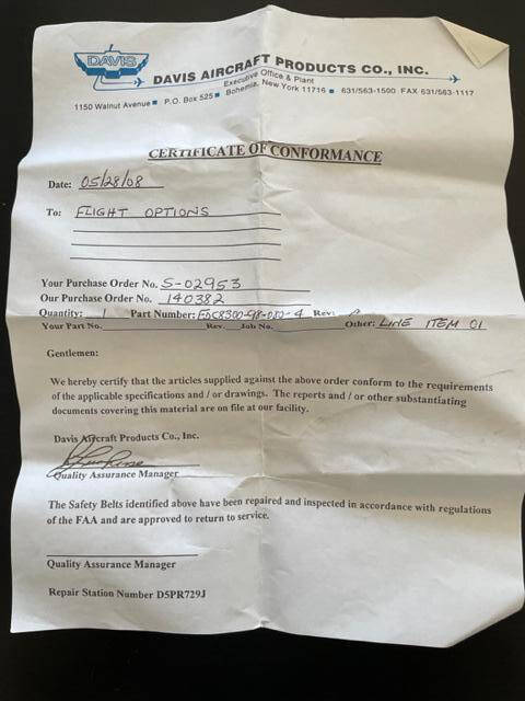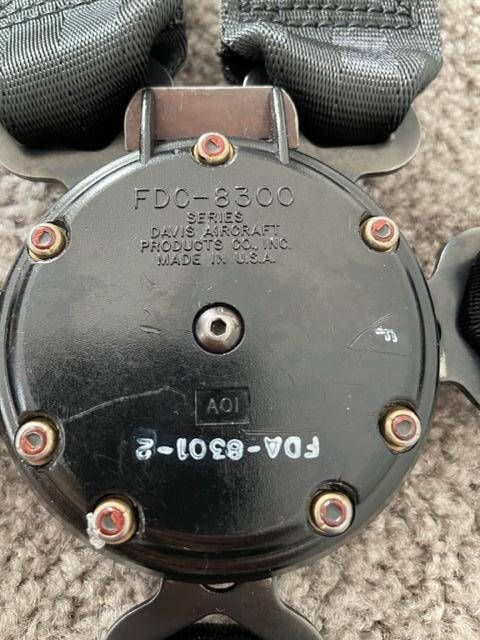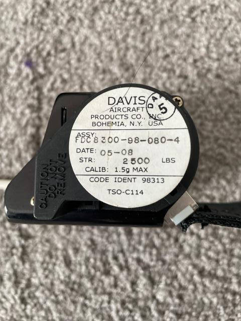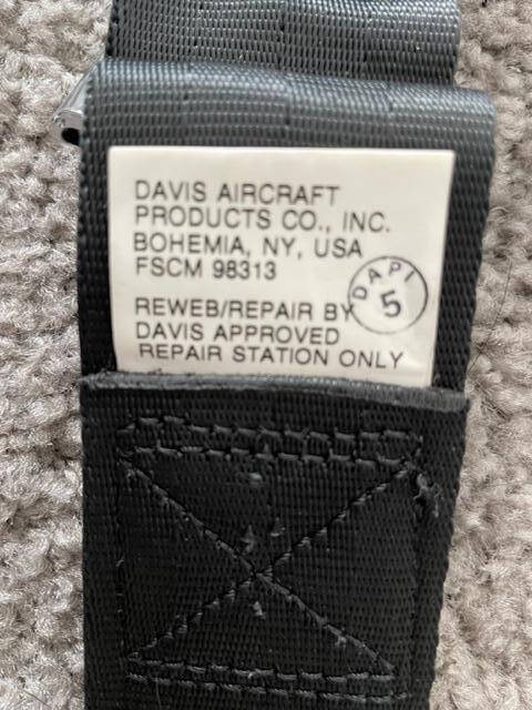 Davis RIGHT SEAT 5-point inertia harness with quick release cable. Overhauled by Davis with invoice and Letter Of Conformance, see photos for details. In as new condition with the exception of the anchor tabs, see photos. Overhaul was conducted for Flight Options so I am assuming application is for a Cessna corporate aircraft.