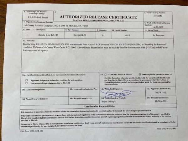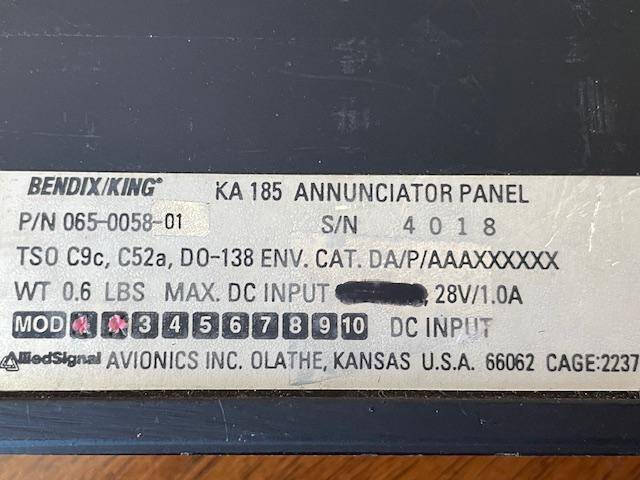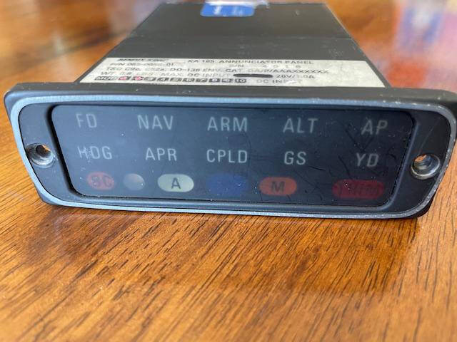 Excellent condition King KA185 autopilot mode annunciator panel. Incliudes Form 8130. Removed by avionics technician from 1998 Beechcraft A36, N184DM, SN E-3199, 3,458TT. Working when removed.