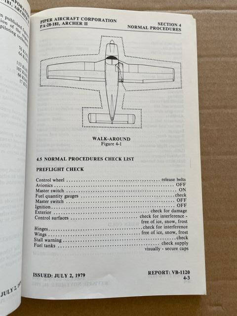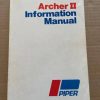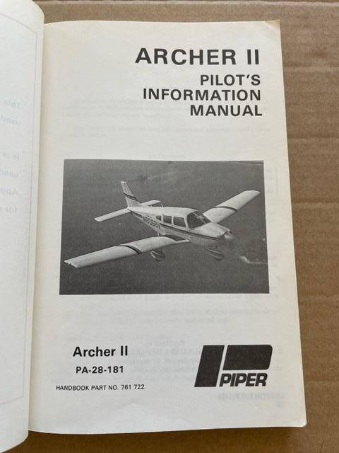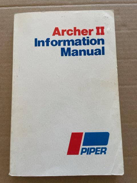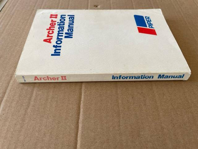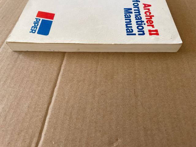 Very good condition 1979 Piper Archer II Information Manual. Cover has some minor wear and dog eared at bottom left. Airspeed notes on first page otherwise excellent page condition. Name on back cover page.