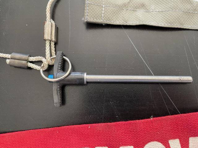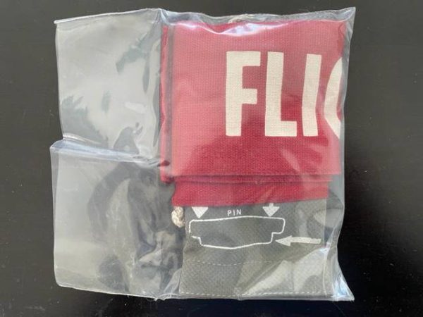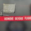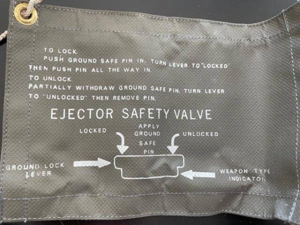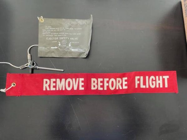 New old stock “Remove Before Flight” warning streamer. Includes ejoctor safety valve pin for ordinance safety. Pin and banner connected by key ring connector so can be used seperately, see photos. One sided lettering. 23 3/4″ length, 3″ width.