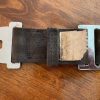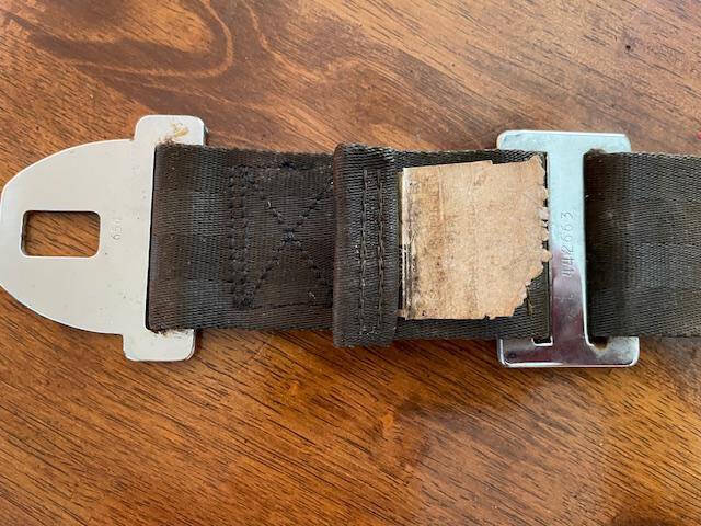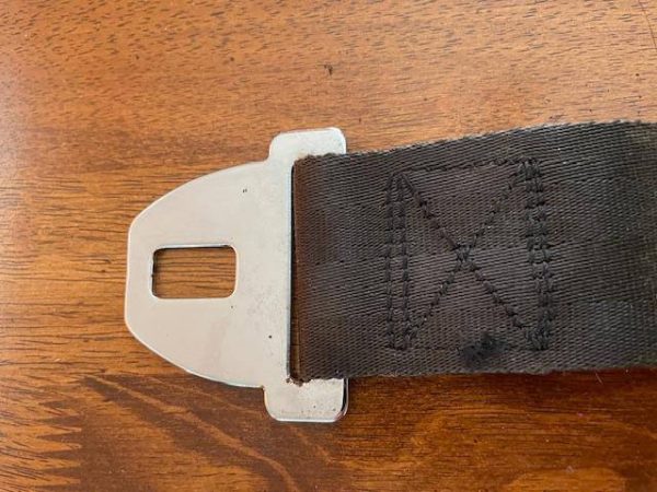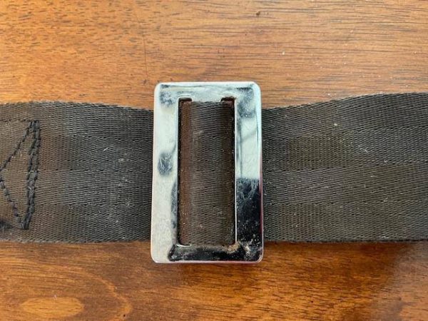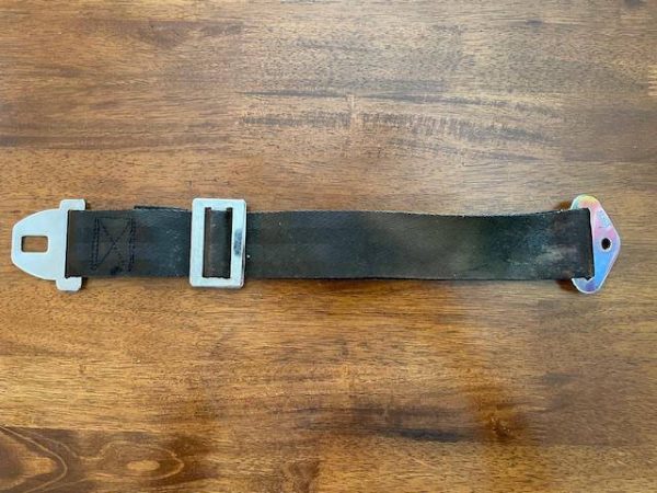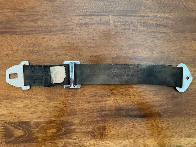 Lake LA4-180 Co-Pilot’s American Safety seat belt, male segment. Black with some dirt and fading but no fraying. No rust on components. Approximately 26″ fully extended.